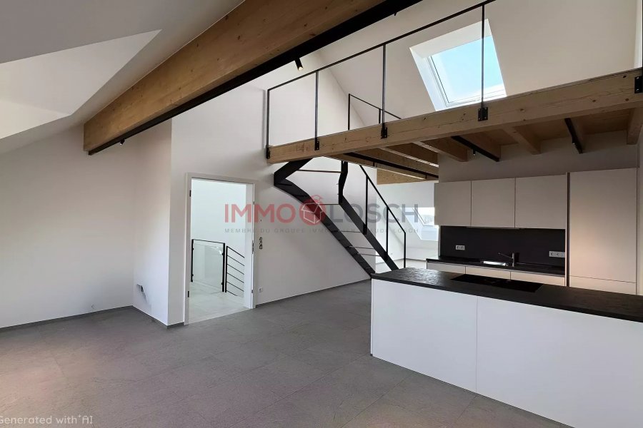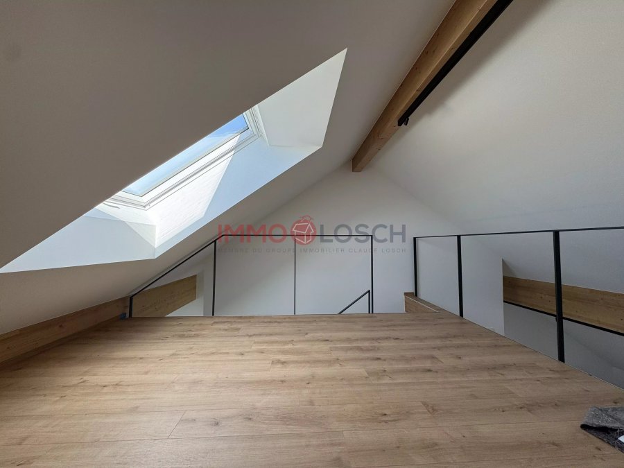 Immo Losch bitt eng schéi, modern 79,89 m² Wunneng zu Olm zur Locatioun, déi dank hirem Mezzanin, deen als Schlofkummer benotzt ka ginn, optiméierten Wunnraum bitt, an engem brandneie Gebai. Immobilie-Beschreiwung: - Entrée - Wunnzëmmer mat oppener, integréierter Kichen - Mezzanin - Duschzëmmer mat WC - oppene Schlofkummer oder Studéierzëmmer