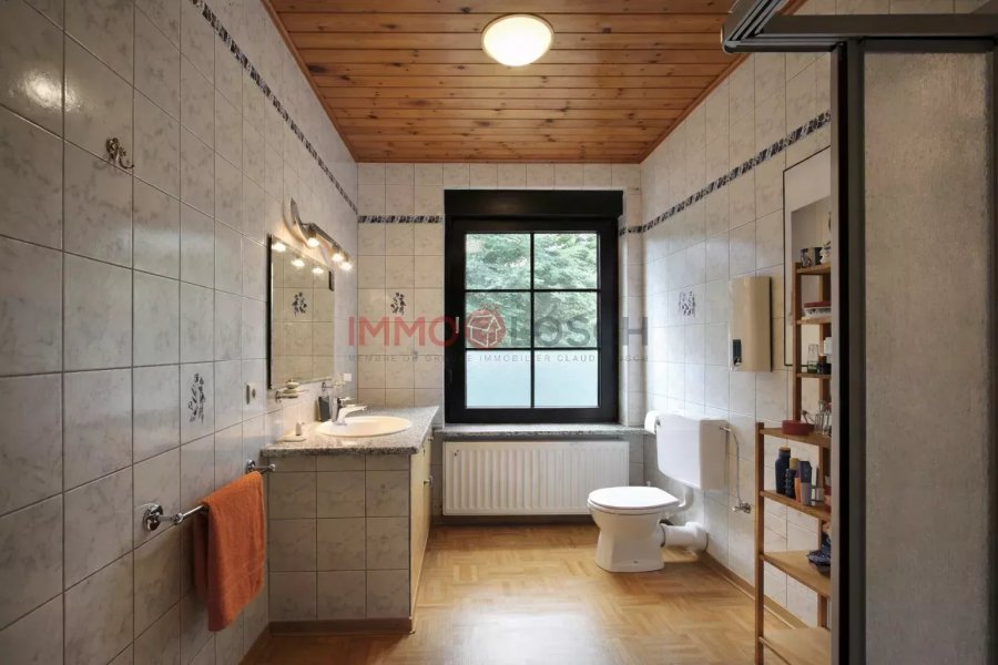 Keller: - Keller - Wäschraum Äussere Beräicher: - Privaten Gaart - Zwee Plazen fir dobaussen ze parkéieren Zousätzlech Informatiounen - Holzbuedem (Parkett a Fliesen) Heizung: Fernwäermung, mat héich performante Systemer wéi Kraft-Wärme-Kopplung a Pelletkessel