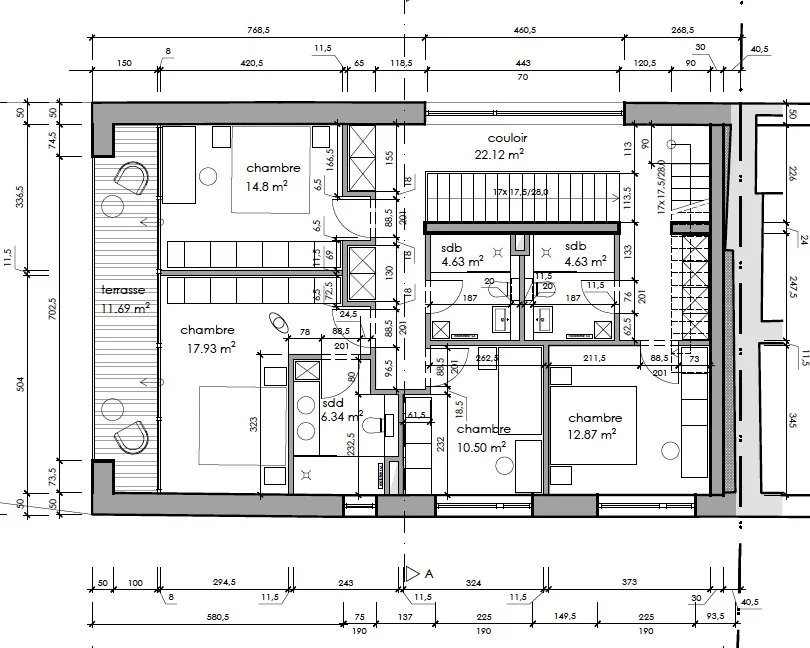 - 1er étage : 3 chambres, salle de bains + appartement intégré (chambre et salle de bain)